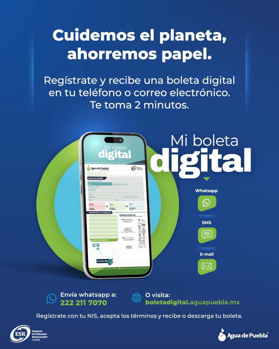 Con el firme compromiso de modernizar la atención a las y los usuarios y avanzar hacia un servicio más sostenible, Agua de Puebla implementó la Boleta Digital, una alternativa ecológica, ágil y completamente segura que ya beneficia a más de 15 mil personas.