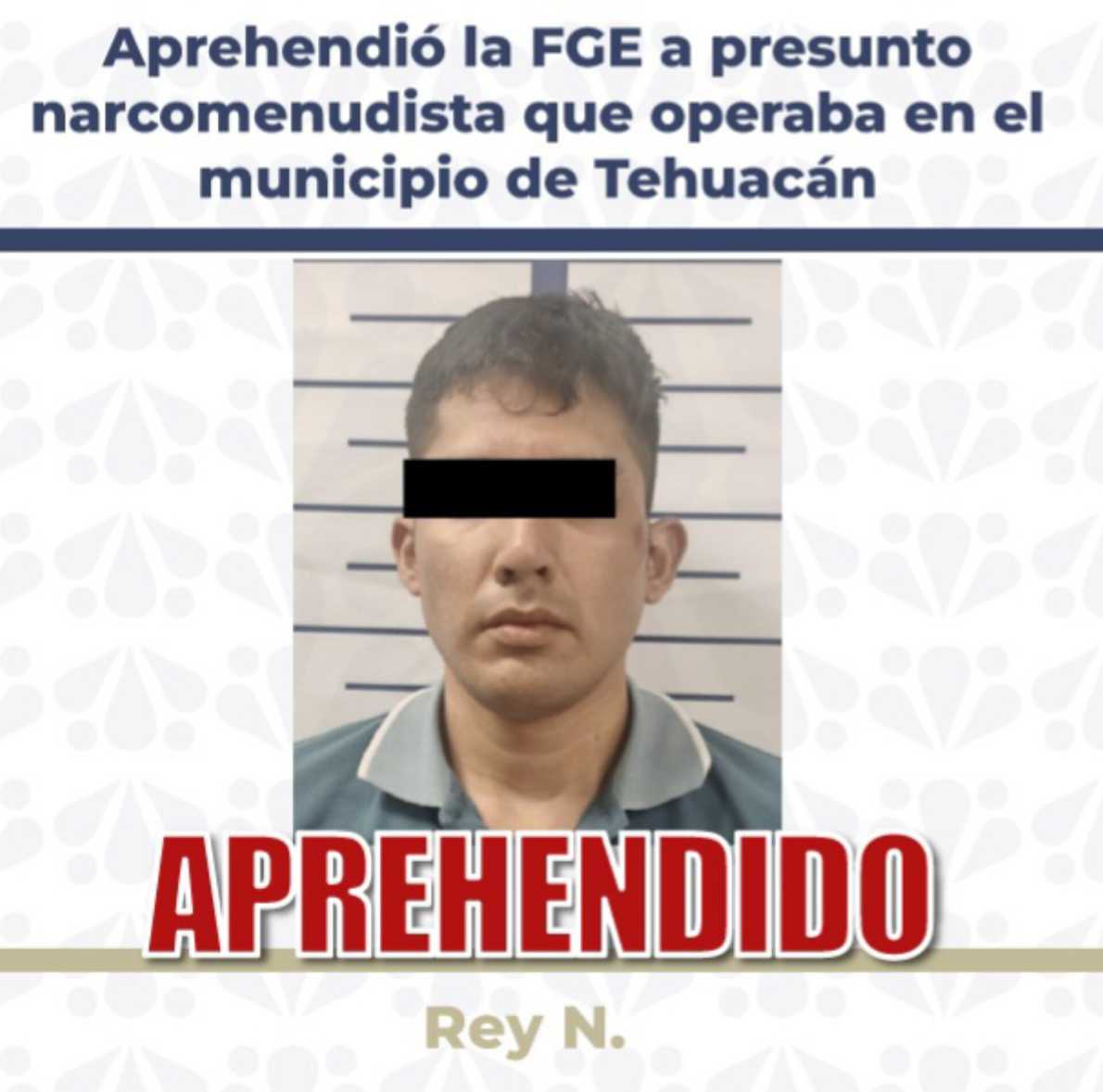 La Fiscalía General del Estado dio cumplimiento a la orden de aprehensión en contra de Rey N., alias “El Flaco”, de 23 años de edad, por su probable responsabilidad en delitos contra la salud en su modalidad de narcomenudeo por posesión simple del psicotrópico denominado metanfetamina, ocurrido en el municipio de Tehuacán, Puebla.