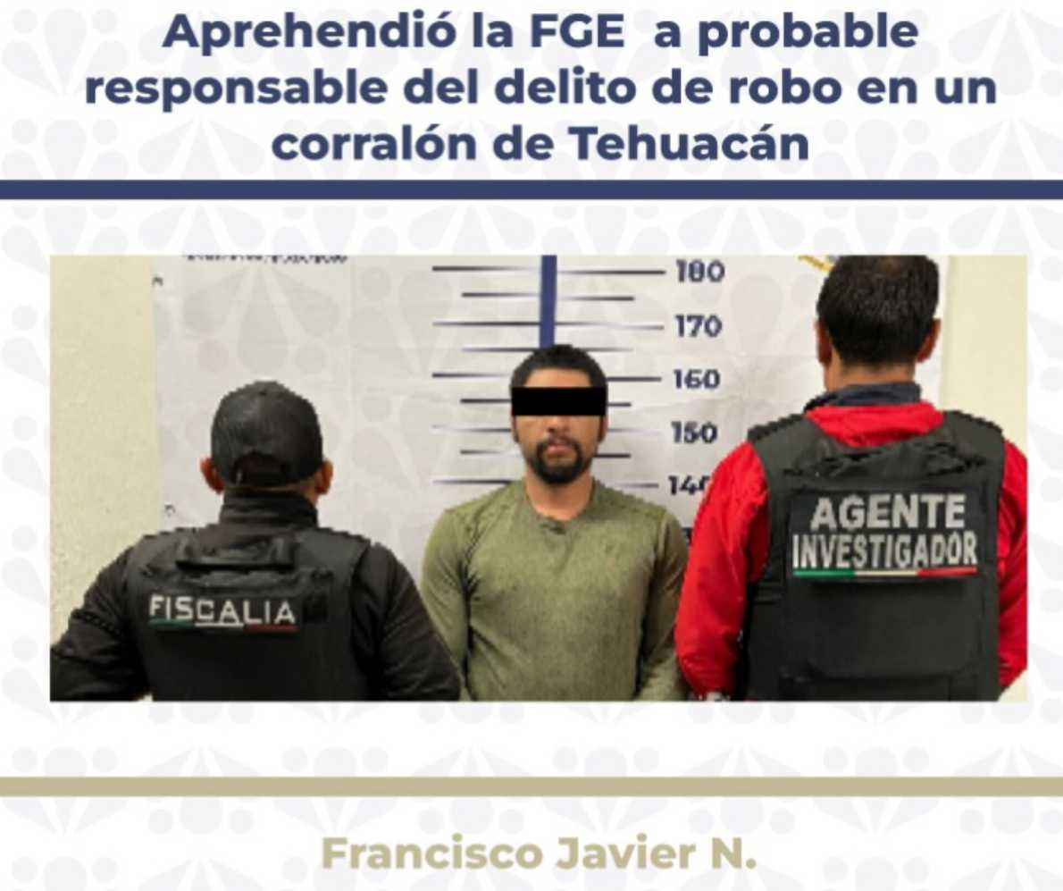 La Fiscalía General del Estado dio cumplimiento a la orden de aprehensión en contra de Francisco Javier N., de 29 años de edad, por su probable responsabilidad en el delito de robo agravado ocurrido en el municipio de Tehuacán, Puebla.