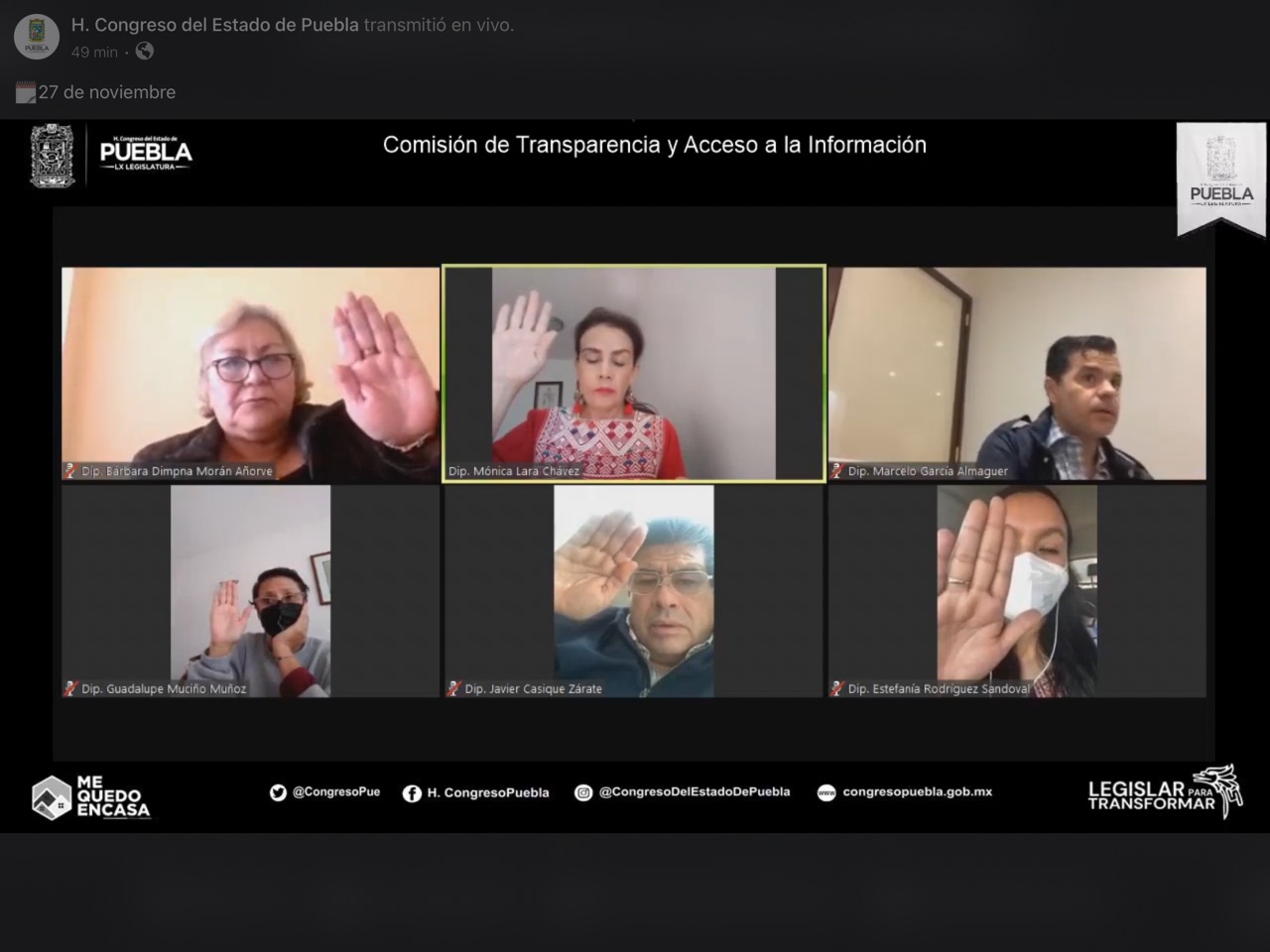 En sesión pública virtual, las y los integrantes de la Comisión de Transparencia y Acceso a la Información del Congreso del Estado, aprobaron por unanimidad, el acuerdo presentado por la diputada Mónica Lara Chávez, por el cual se invita a un representante de los grupos parlamentarios que conforman la LX Legislatura, a participar en el desahogo de las comparecencias de los aspirantes a ocupar el cargo de Comisionado del Instituto de Transparencia y Acceso a la Información Pública del Estado de Puebla ( ITAIPUE).