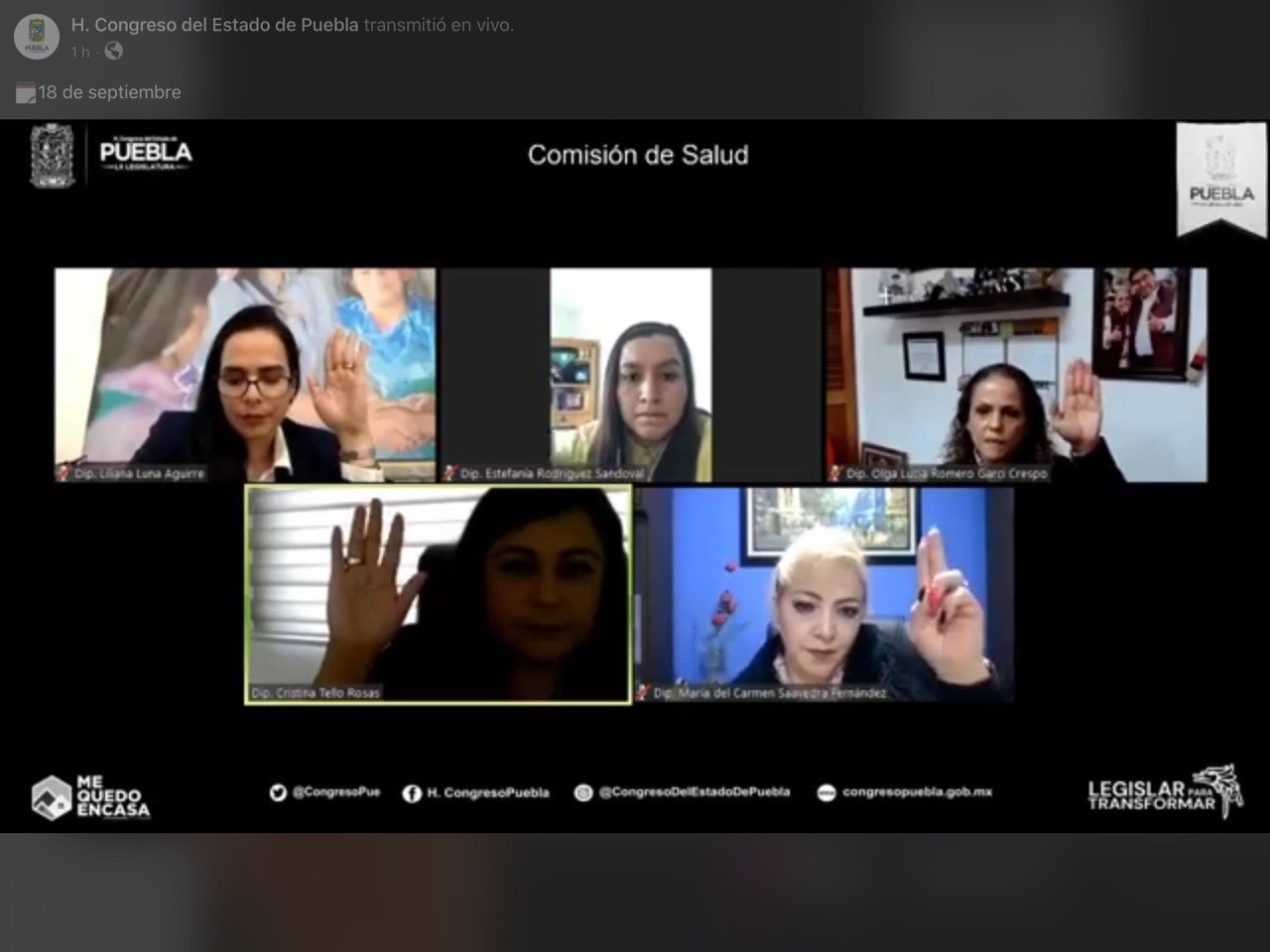 En sesión virtual de la Comisión de Salud de la LX Legislatura del Congreso del Estado aprobaron, por unanimidad, un exhorto dirigido a la Secretaría de Salud de Puebla, así como las delegaciones del IMSS e ISSSTE, para que emitan lineamientos y protocolos que garanticen el derecho de comunicación de pacientes hospitalizados por la COVID-19 con sus familiares e individuos de confianza a través de herramientas digitales que permitan sostener llamadas y videollamadas.