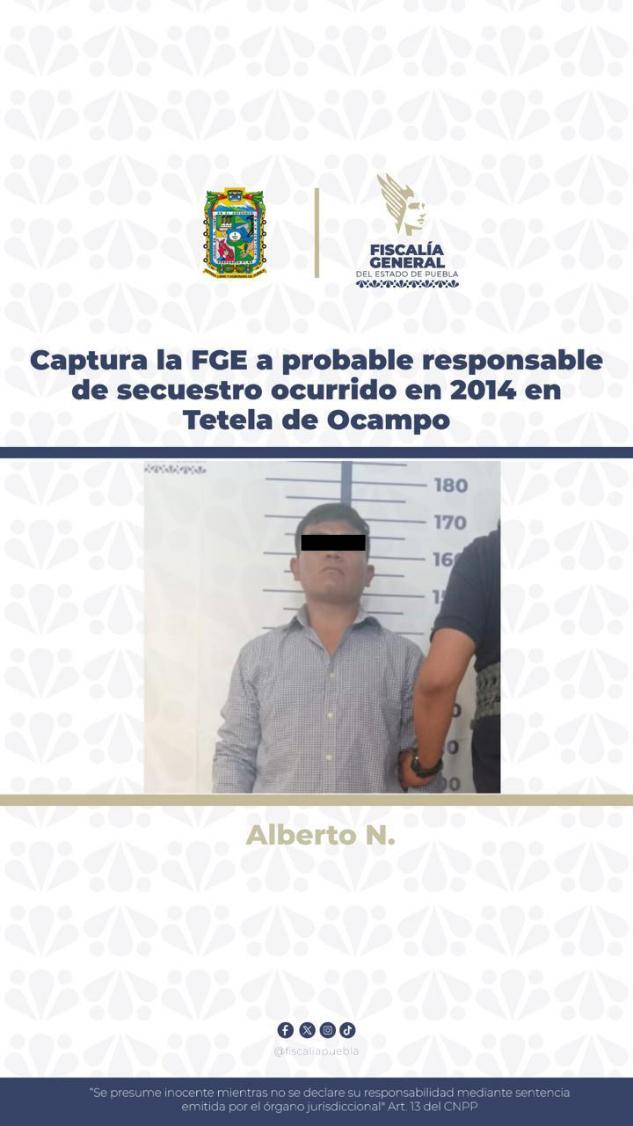 La Fiscalía General del Estado de Puebla aprehendió a Alberto N., de 28 años de edad, identificado como probable responsable del delito de secuestro, ocurrido el 30 de julio de 2014, en el municipio de Tetela de Ocampo.
