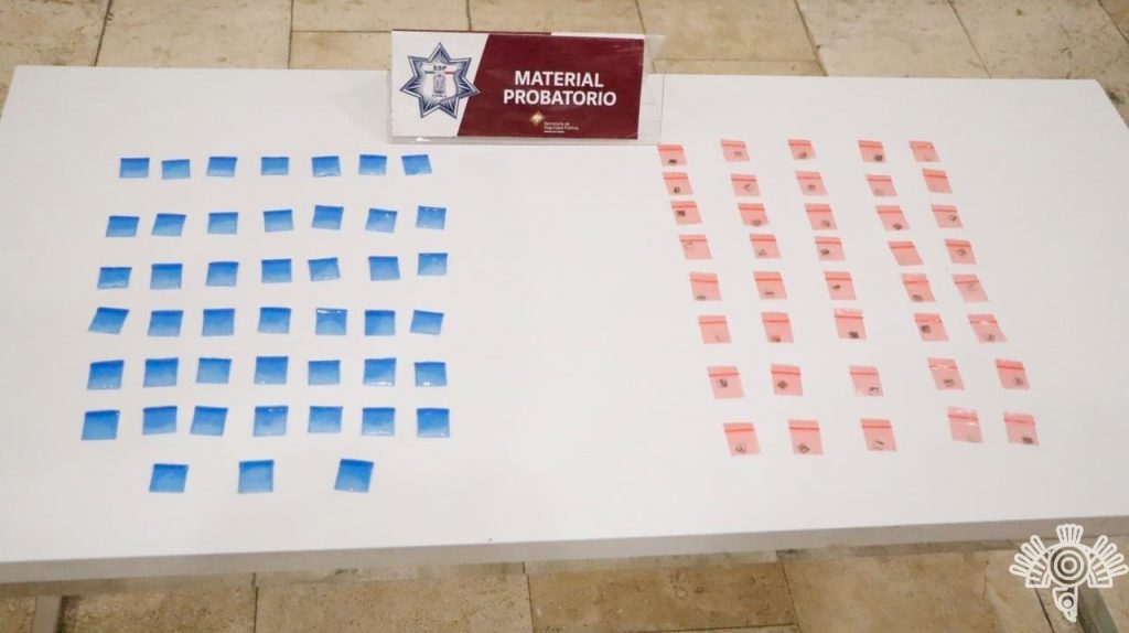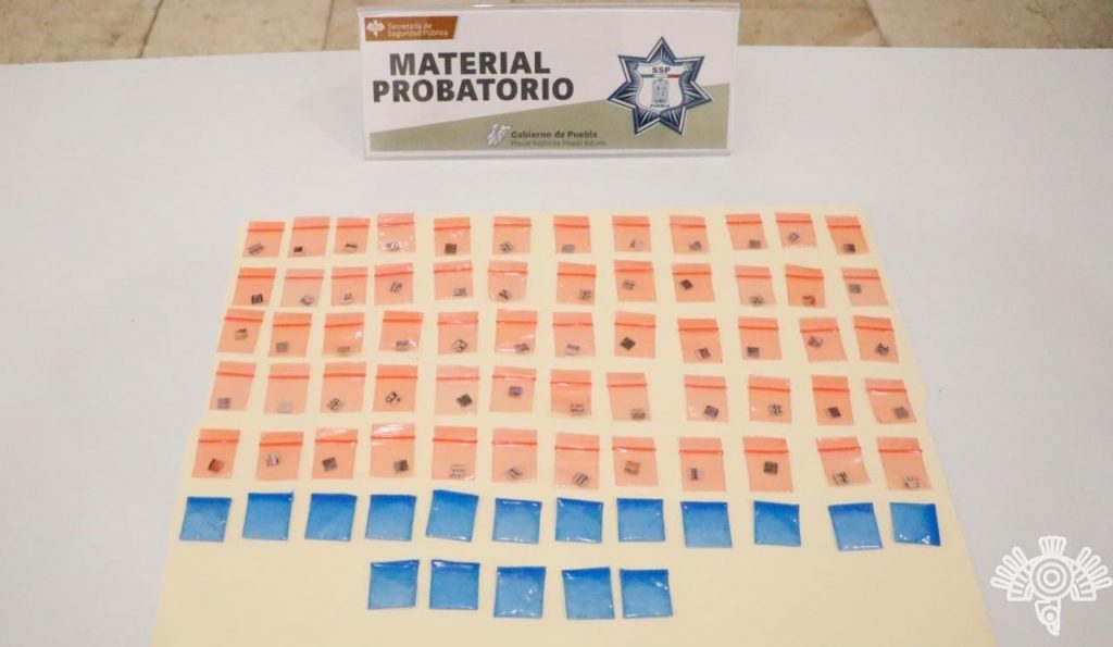 La primera detención se registró en inmediaciones de Santiago Mixquitla, barrio del municipio de San Pedro Cholula; el hoy detenido se identificó como Luis Antonio R., de 22 años, quien se encontraba en posesión de 17 envoltorios con una sustancia granulada con las características de la droga conocida como cristal y 60 piezas de papel absorbente, presumiblemente LSD.