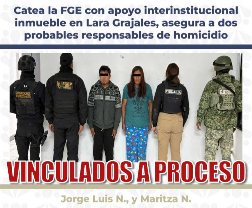 La Fiscalía General del Estado de Puebla informa que derivado de un homicidio ocurrido en el municipio de Rafael Lara Grajales, realizó un cateo en un inmueble de la región con apoyo interinstitucional de la Secretaría de la Defensa Nacional (DEFENSA) y de la Secretaría de Seguridad Pública del Estado (SSPE), logrando la detención de Jorge Luis N. y Maritza N., de 29 y 39 años de edad, respectivamente, como probables responsables del ilícito.