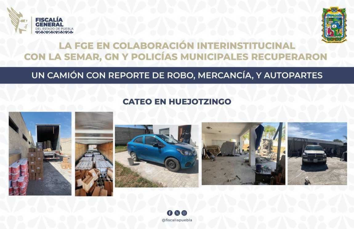 Como resultado de la coordinación interinstitucional, la Fiscalía General del Estado de Puebla en coordinación con la Secretaría de Marina, Guardia Nacional y autoridades municipales, realizó un cateo en el municipio de Huejotzingo donde se recuperó un camión con reporte de robo y mercancía consistente en botes de pintura y autopartes. De acuerdo con la denuncia, el 23 de enero de 2025, se registró el robo del vehículo marca Freightliner, tipo tractocamión, modelo 2016, con placas de circulación 89AR6, acoplado a una caja marca Fruehauf, con placas de circulación 8202XB4, cargado con pintura.