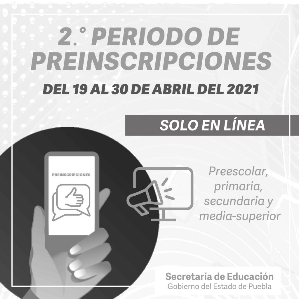 A partir de hoy lunes 19 al 30 de abril, se llevará a cabo el segundo período de preinscripciones en línea para alumnos que cursan niveles de educación obligatoria; madres y padres de familia que no pudieron efectuar el trámite en la primera etapa o en forma presencial en las Coordinaciones de Desarrollo Educativo (Corde’s), podrán hacerlo en esta nueva fase, informa la Secretaría de Educación.