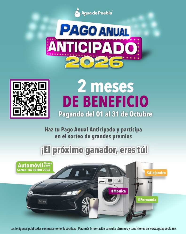 Agua de Puebla inicia este primero de octubre de 2025 su tradicional programa “Pago Anual Anticipado 2026” para reconocer y agradecer la lealtad de los usuarios cumplidos, premiándolos con 2 meses de beneficio para todos los usuarios de uso doméstico que realicen su pago adelantado del 2026, si pagan del 1ro al 31 de octubre del presente año.