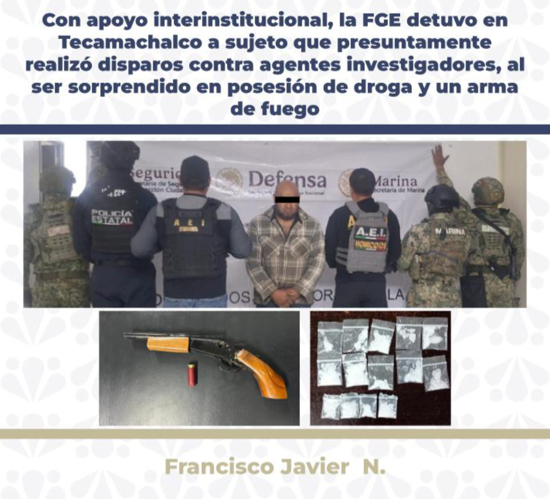 La Fiscalía General del Estado (FGE) con apoyo interinstitucional, detuvo en flagrancia delictiva a Francisco Javier N., de 38 años de edad, por hechos con apariencia del delito de homicidio calificado en grado de tentativa, así como por la posesión de droga y de un arma de fuego.