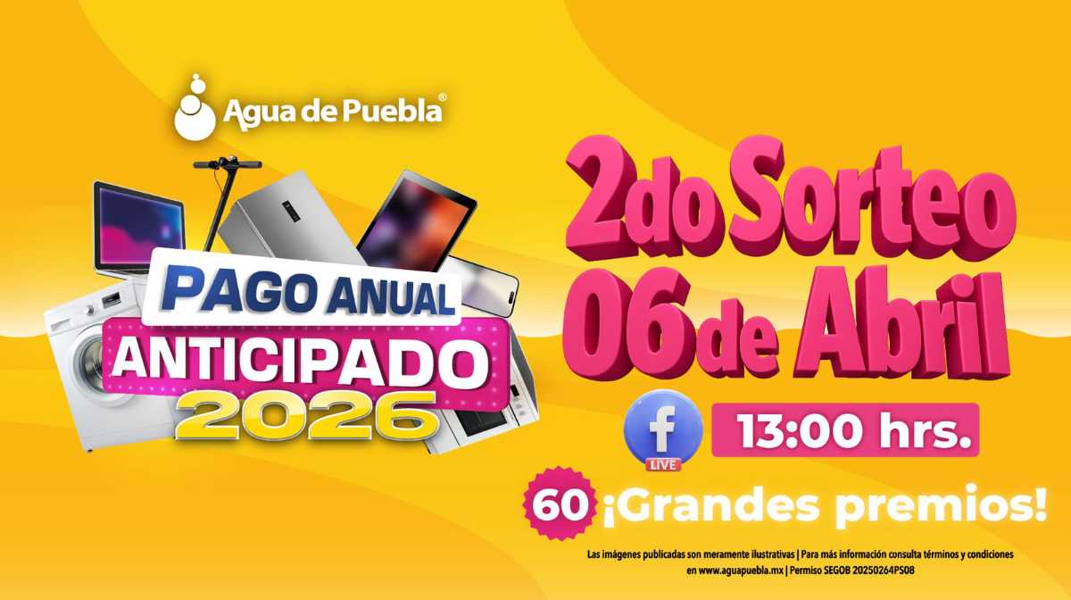 Como muestra de agradecimiento a la lealtad y confianza de más de 166 mil usuarios que realizaron su Pago Anual Anticipado desde octubre 2025 a marzo 2026, Agua de Puebla realizará este lunes 6 de marzo la segunda rifa de 60 grandes premios.