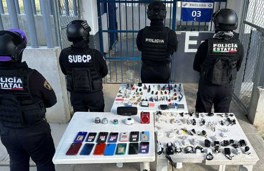 Durante esta operación, que tuvo el objetivo de inhibir la comisión de delitos desde este penal, policías estatales custodios decomisaron 14 celulares, cargadores, cables USB, audífonos inalámbricos y otros accesorios.