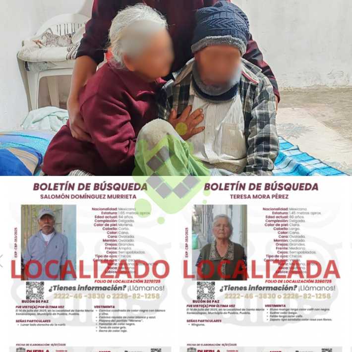 Por instrucción del Gobernador del Estado de Puebla, Alejandro Armenta, y bajo el principio de que “Lo que más amas, lo cuidas”, la Comisión de Búsqueda de Personas del Estado, encabezada por Juan Enrique Rivera Reyes, localizó con vida a Teresa N., de 80 años, y a Salomón N., de 84 años.