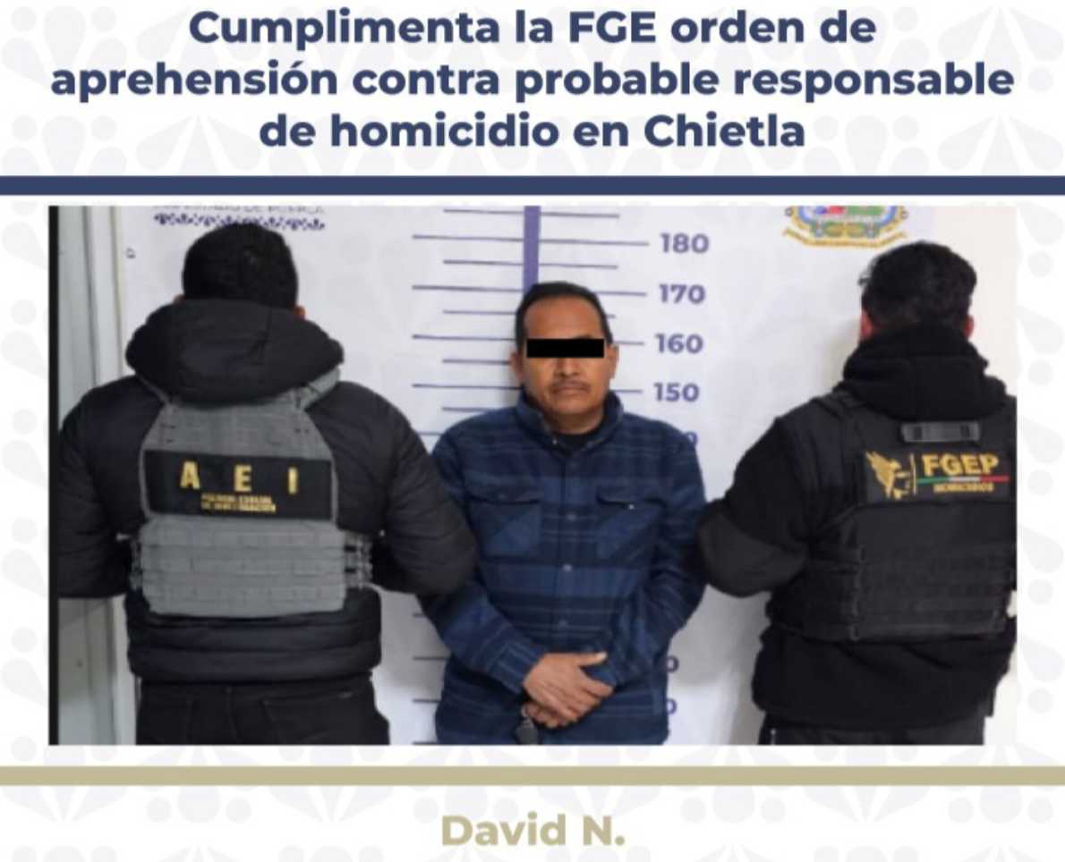 La Fiscalía General del Estado de Puebla detuvo a David N., en cumplimiento a una orden de aprehensión en su contra, por su probable participación en el delito de homicidio calificado, ocurrido en el municipio de Chietla.