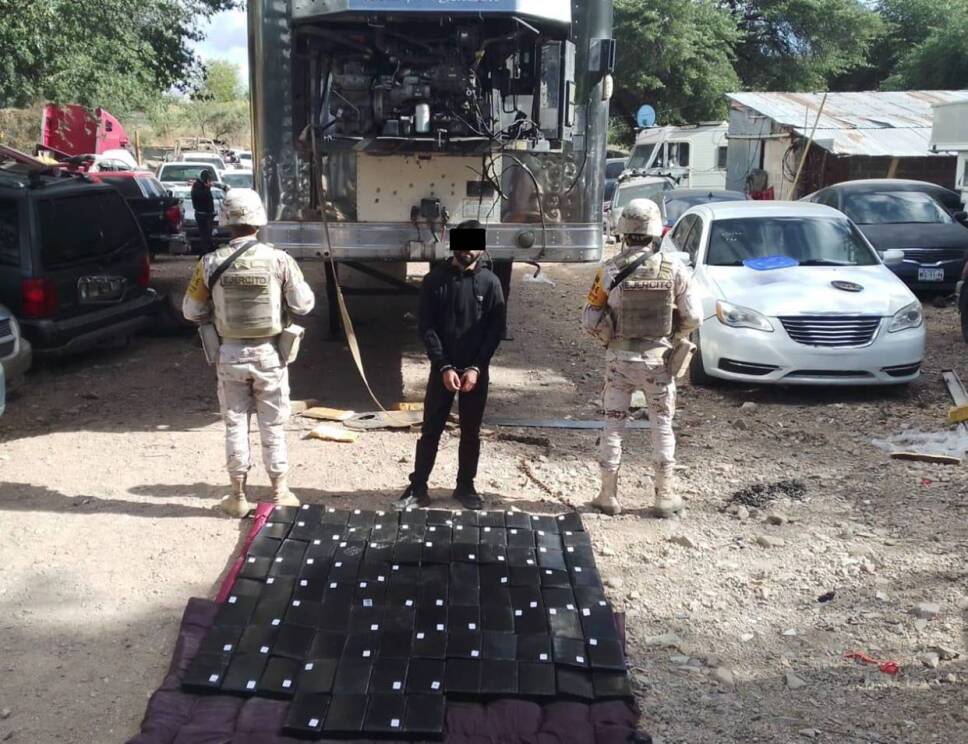 Mediante la revisión a un tractocamión procedente de Culiacán, Sin., con destino a Nogales, Son., personal del Ejército Mexicano en coordinación con la Guardia Nacional localizaron en la caja de refrigeración 100 paquetes que en su interior contenían un polvo blanco con similitudes a la cocaína, con un peso aproximado de 1 kilogramo cada uno.