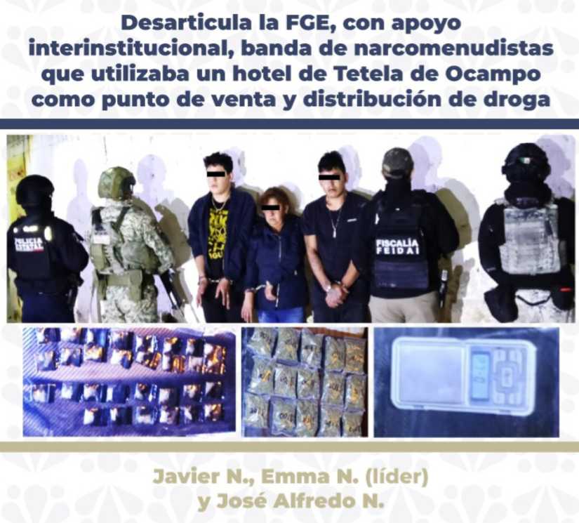 La Fiscalía General del Estado informa que, en seguimiento a las acciones para combatir el narcomenudeo, se llevó a cabo un operativo con apoyo interinstitucional en el municipio de Tetela de Ocampo, donde fue desarticulada una banda presuntamente integrada por Emma N., supuesta líder, así como Javier N. y José Alfredo N.