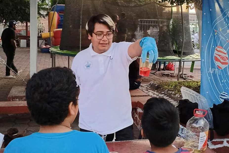 Flor Galeana Juárez, alumna de la Licenciatura en Física Aplicada participa desde 2023 en este programa y refiere: “Desde niña tuve contacto con distintas comunidades, porque mi madre trabajaba en Inegi y viajábamos constantemente, por eso estoy acostumbrada a convivir con la gente de los pueblos. De los talleres me interesa la forma en cómo se abordan los temas, buscar herramientas para que todas las personas que participan, de diferentes edades e intereses, puedan centrar su atención en lo que estás hablando. Es un reto porque tienes que adecuar los conocimientos a su contexto. Creo que lo que más valoro es que enseñas a los demás, pero también aprendes mucho”.