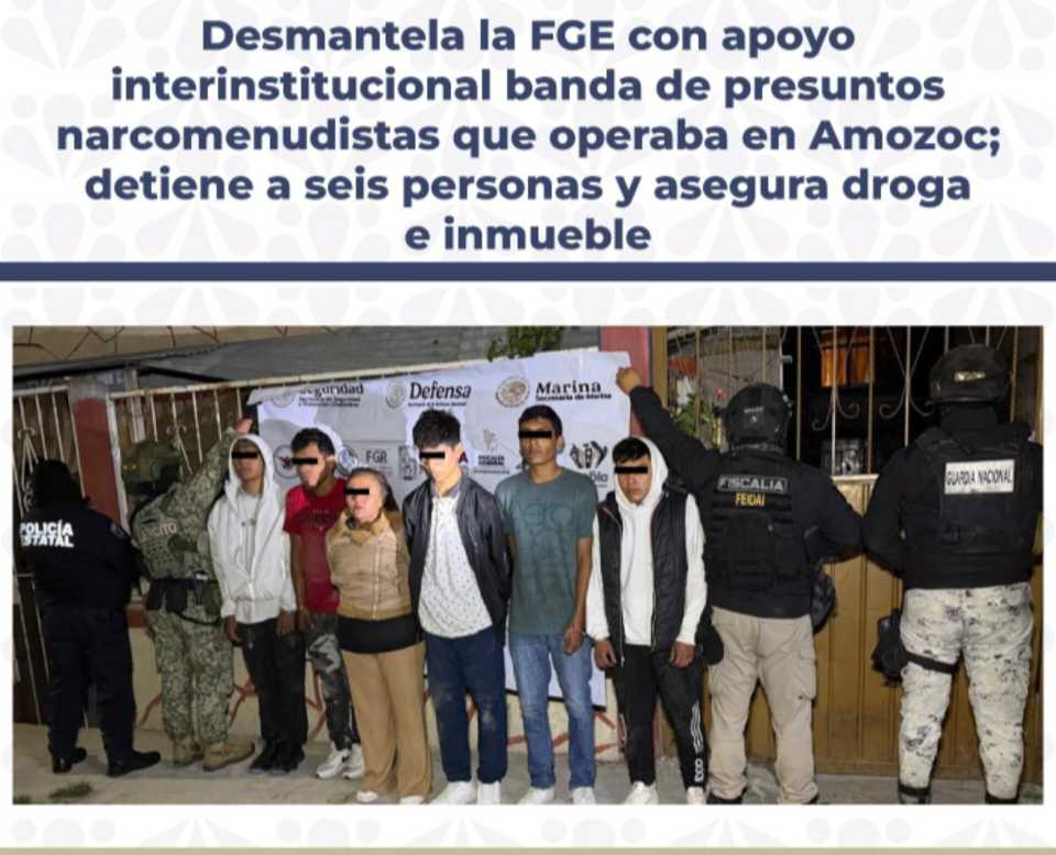 Como resultado de un operativo encabezado por la Fiscalía General del Estado de Puebla (FGE), con apoyo de la Secretaría de la Defensa Nacional (DEFENSA), la Guardia Nacional (GN) y la Secretaría de Seguridad Pública Estatal (SSPE), se logró desmantelar a una presunta banda de narcomenudistas que operaba en el municipio de Amozoc, Puebla. Durante cateo fueron detenidas seis personas y se aseguró droga.