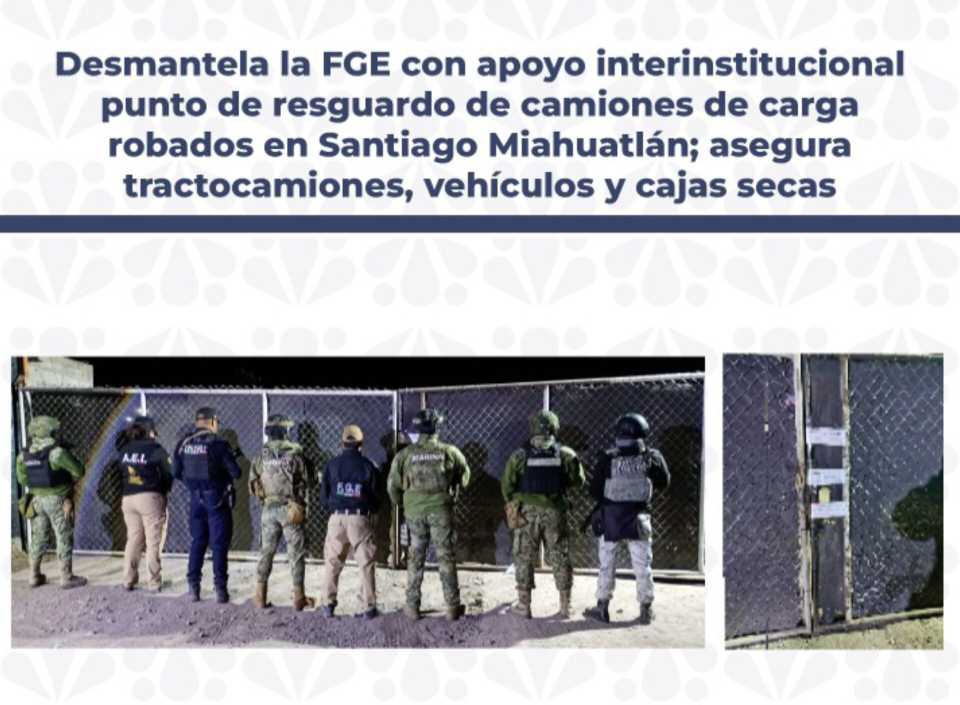 Como resultado de un operativo contra el robo de transporte de carga, la Fiscalía General del Estado (FGE), en coordinación con la Secretaría de la Defensa Nacional (DEFENSA), la Secretaría de Marina (SEMAR), la Guardia Nacional (GN) y la Secretaría de Seguridad Pública Estatal (SSPE), desmanteló un punto de resguardo clandestino en el municipio de Santiago Miahuatlán, donde se almacenaban camiones robados, vehículos compactos, cajas secas, plataformas y otros indicios.