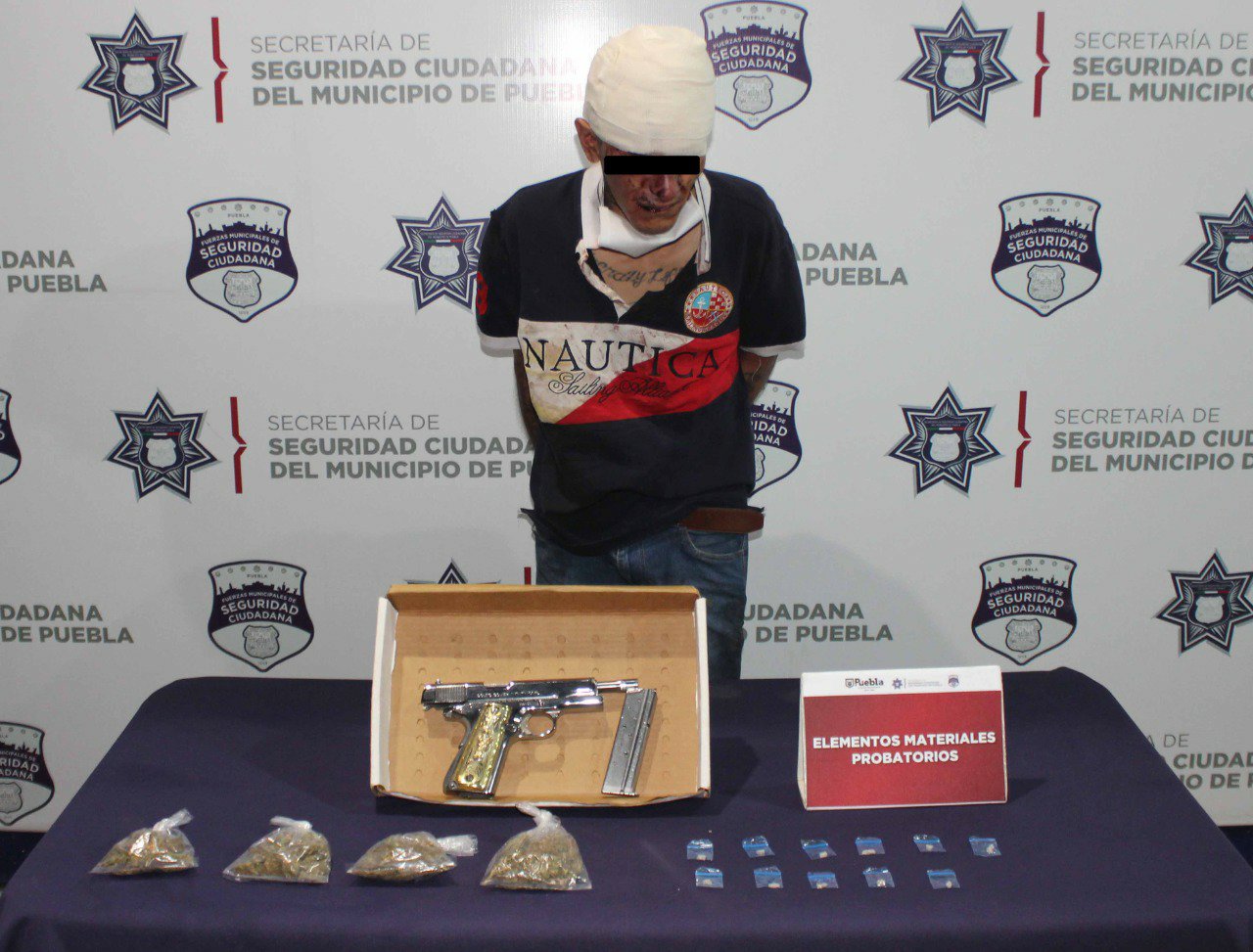 Enseguida, se solicitó la presencia de paramédicos adscritos a la Unidad Táctica de Reacción (UTR), quienes brindaron atención prehospitalaria al individuo. Paralelamente, las Fuerzas Municipales hallaron entre las pertenencias del varón un arma de fuego, tipo escuadra, con incrustaciones en aparente oro así como, envoltorios de hierba verde con características a la marihuana y dosis de posible heroína.