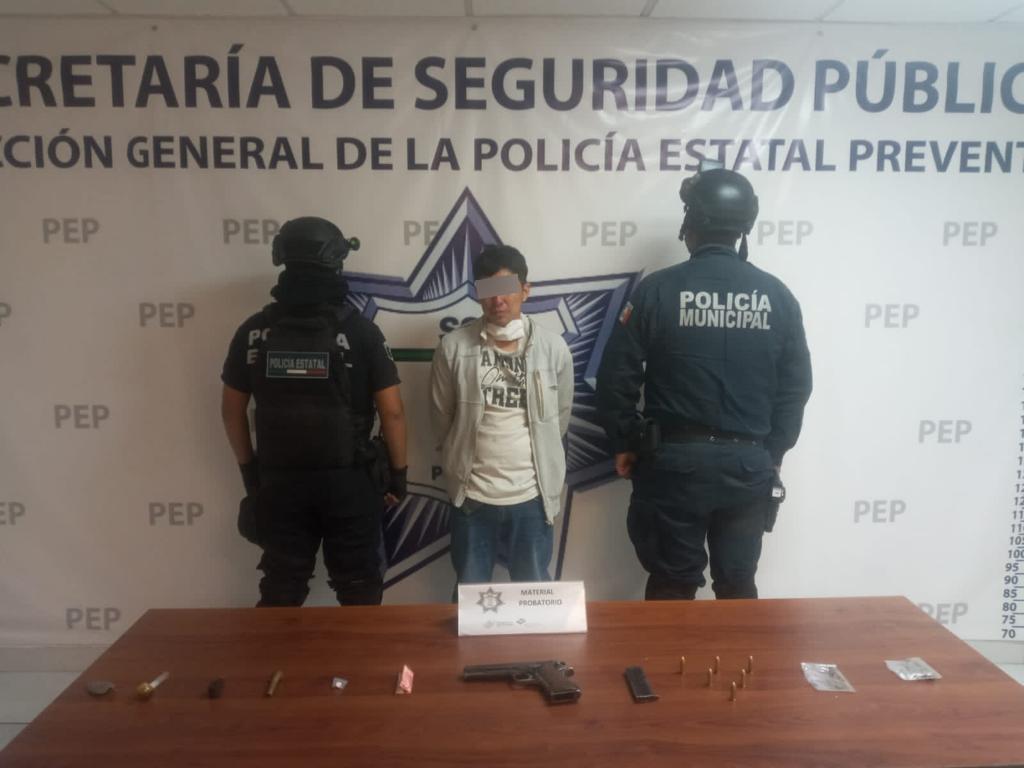 El hombre viajaba a bordo de una motocicleta marca Suzuki en la que transportaba un arma de fuego calibre .9 con seis cartuchos útiles, dos bolsas con aparente marihuana y otra con una sustancia con las características de la droga conocida como piedra, así como tres pipas.