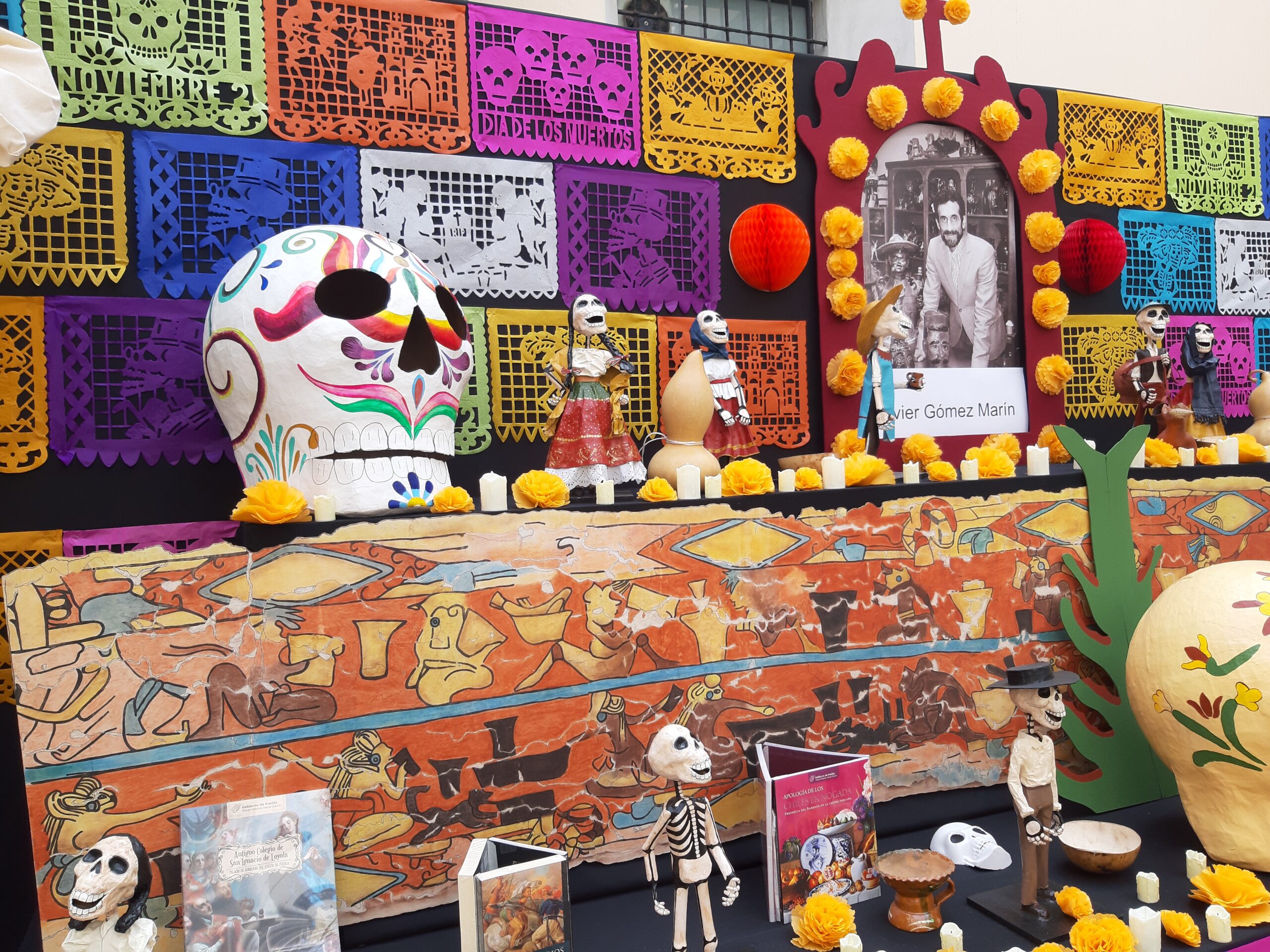 En los altares a los muertos se fusionan las costumbres prehispánicas y las traídas por los españoles: podemos encontrar las calaveras de dulce que nos recuerdan los tzompantli mexicas (o “muros de cabezas”), junto con alguna imagen religiosa (un crucifijo, la Virgen María, un santo).