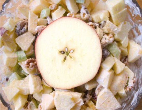 La ensalada de manzana fue creada en Nueva York en 1823, por el chef Oscar Tschirky, quien ese año estaba buscando un nuevo platillo para servir en el restaurante del Hotel Waldorf Astoria. Se le ocurrió utilizar manzana, mayonesa y apio, la cual tuvo un éxito rotundo.