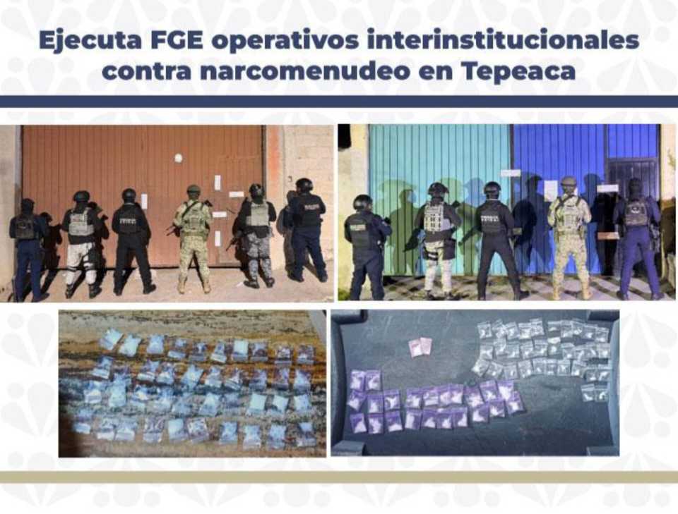 La Fiscalía General del Estado de Puebla (FGE), en coordinación interinstitucional, ejecutó dos cateos en inmuebles, como parte de actos de investigación por delitos contra la salud, en hechos registrados en el municipio de Tepeaca.