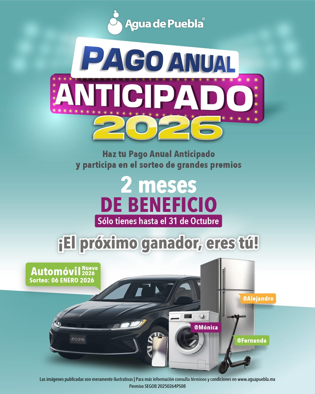 Agua de Puebla reitera a los usuarios cumplidos que el próximo 31 de octubre es el último día para realizar su “Pago Anual Anticipado 2026” con 2 meses de beneficio para todos los usuarios de uso doméstico que realicen su pago adelantado, esto es, pagan sólo 10 meses y quedan liquidados los 12 meses del 2026, además de que quedan congelados sus pagos con tarifas actuales del 2025.