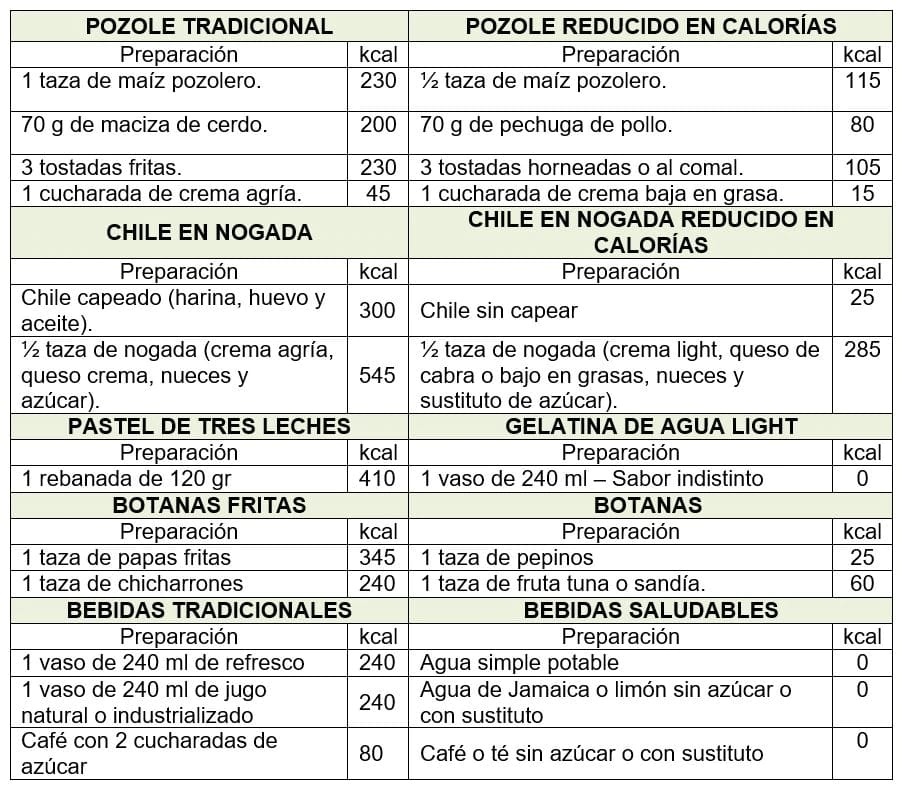 Respecto a los platillos típicos de la época, se presenta una tabla con la preparación tradicional (izquierda) y la recomendación del IMSS (derecha) para estas fiestas: