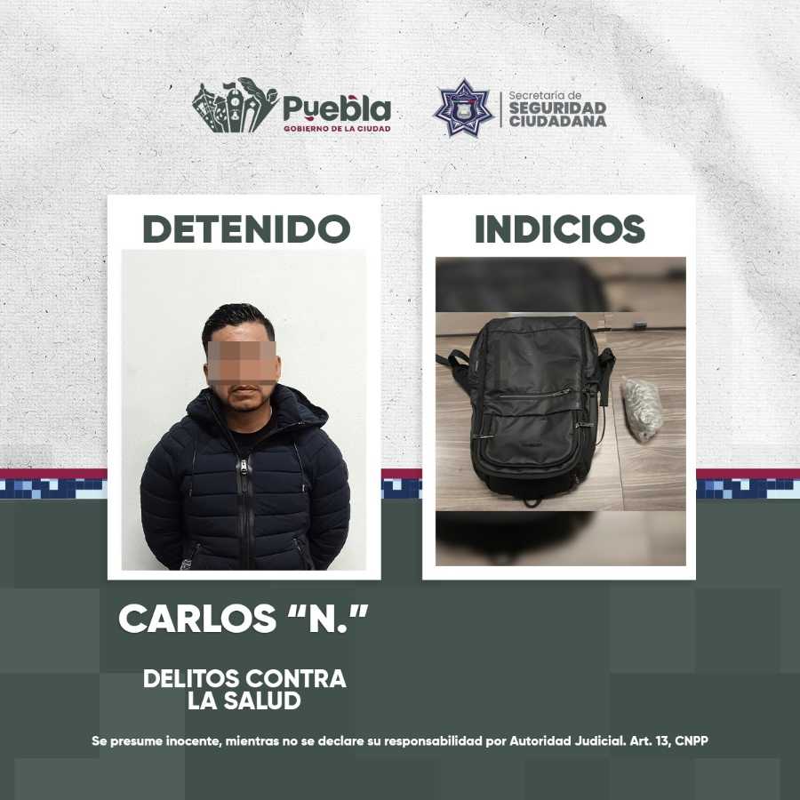 Elementos de la Policía de la Ciudad, a través de la Unidad Canina K9, detuvieron a un hombre, como presunto responsable de delitos contra la salud, en inmediaciones de la Central de Autobuses de Puebla (CAPU).