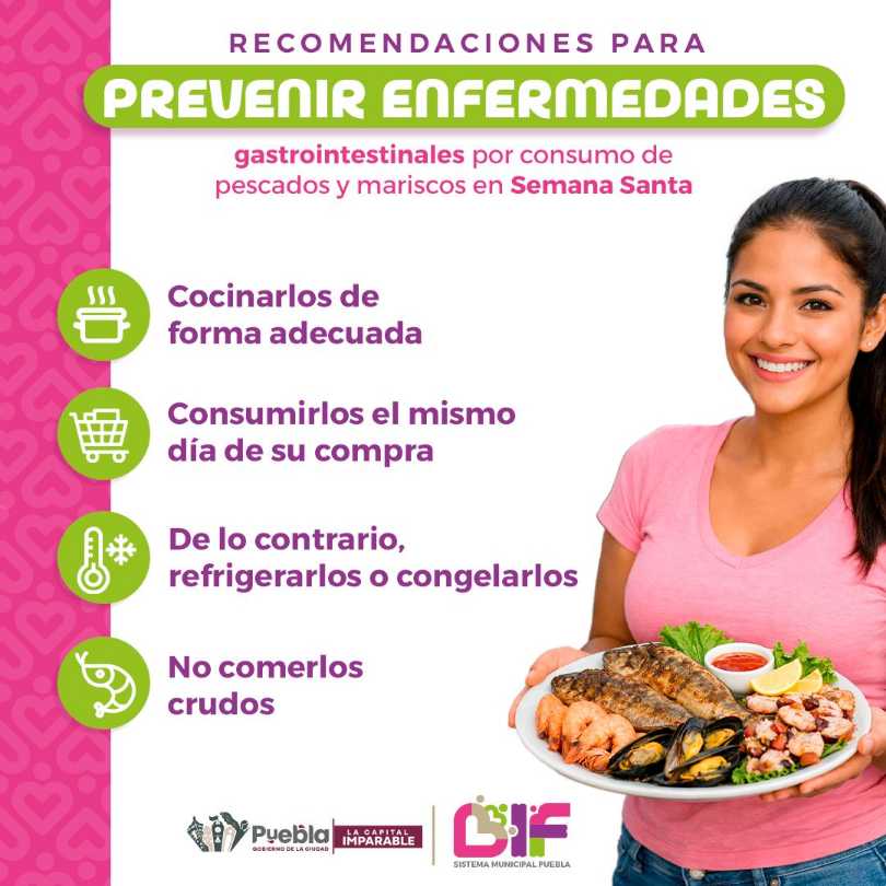Con el objetivo de privilegiar la salud de las y los poblanos durante la temporada de Semana Santa, el Gobierno de la Ciudad liderado por el presidente municipal, Pepe Chedraui, y el DIF Puebla Capital encabezado por la presidenta del Patronato, MariElise Budib, invitó a las familias poblanas a consumir alimentos manejados y cocinados de forma adecuada para prevenir enfermedades gastrointestinales.