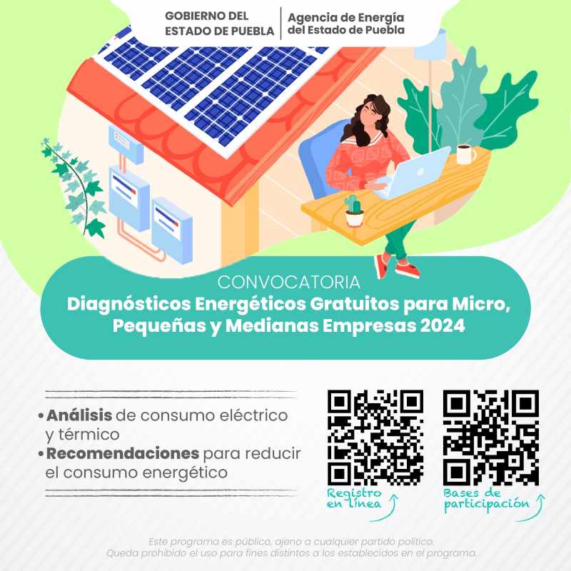 La Agencia de Energía del Estado de Puebla informa de la emisión de la convocatoria “Diagnósticos Energéticos para Micro, Pequeñas y Medianas Empresas 2024”, cuyo fin es realizar 10 diagnósticos energéticos para identificar oportunidades de mejora en eficiencia energética.