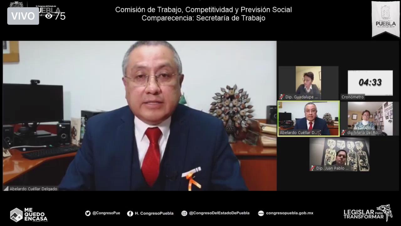 En sesión virtual de la Comisión del Trabajo, Competitividad y Previsión Social de la LX Legislatura, compareció el titular de la Secretaría del Trabajo, Abelardo Cuéllar Delgado, como parte del análisis de la glosa del segundo informe de labores del Ejecutivo Estatal para detallar los planes y programas que desarrolla este organismo para combatir el desempleo, la discriminación y la desigualdad laboral en los centros de trabajo en el estado de Puebla.