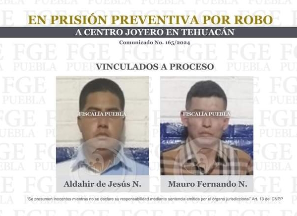 Por su presunta responsabilidad en la comisión de los delitos de robo agravado y portación de arma de fuego sin licencia, la Fiscalía General del Estado de Puebla logró obtener la vinculación a proceso de Aldahir de Jesús N. y Mauro Fernando N.