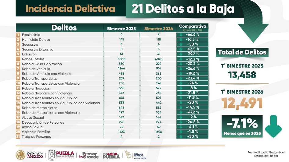 Durante el primer bimestre de 2026, la incidencia delictiva registró una disminución del siete por ciento en comparación con el mismo periodo de 2025, lo que se traduce en 21 delitos a la baja. «Tenemos la convicción plena, que nuestra responsabilidad coadyuvará con la seguridad, procurar la justicia y contribuir al desarrollo de la riqueza comunitaria», afirmó el gobernador de Puebla Alejandro Armenta Mier.