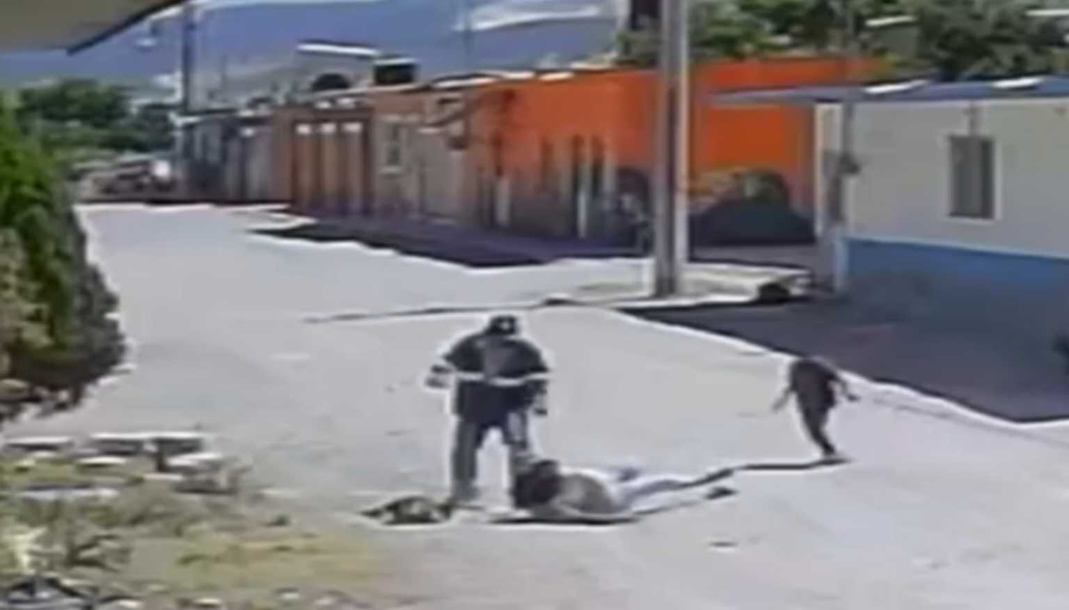 Armando se acerca y de inmediato le tira golpes a la cara y el cuerpo, la toma por el cabello y le da de patadas en el suelo frente al menor.
