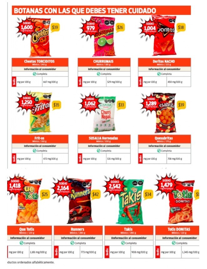 El producto que presentó el mayor contenido de sodio fueron los Takis originales, los cuales contienen 2 mil 542 miligramos de sodio. A este le siguieron los Runners, con 2 mil 164 miligramos; los Cheetos Torciditos con mil 600; los Totis Donitas con mil 479; Que Totis con mil 418; Quesabritas con mil 289.