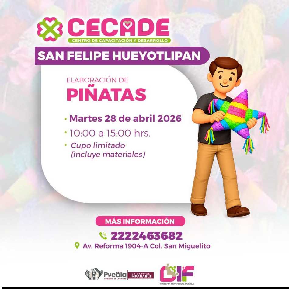 Con el objetivo de impulsar el aprendizaje de oficios y promover el autoempleo, se llevará a cabo el “Taller de Elaboración de Piñatas” en la junta auxiliar de San Felipe Hueyotlipan, una actividad que busca fortalecer las tradiciones mexicanas a través de la capacitación comunitaria.