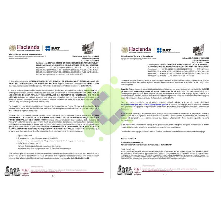 El Servicio de Administración Tributaria (SAT) notificó formalmente al SOSAPAHUE un crédito fiscal pendiente por un total de $8,974,537.00, acumulado durante años por incumplimientos de gestiones pasadas. Debido a esto, el SAT ha iniciado un procedimiento de embargo sobre los créditos del SOSAPAHUE, lo que significa que comenzará a cobrar directamente a los usuarios con pagos pendientes.