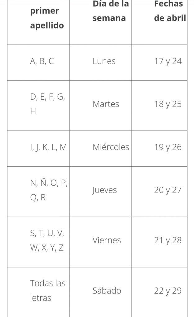 El registro se realizará de acuerdo con la letra inicial del primer apellido de la persona adulta mayor, bajo el siguiente calendario de registro: