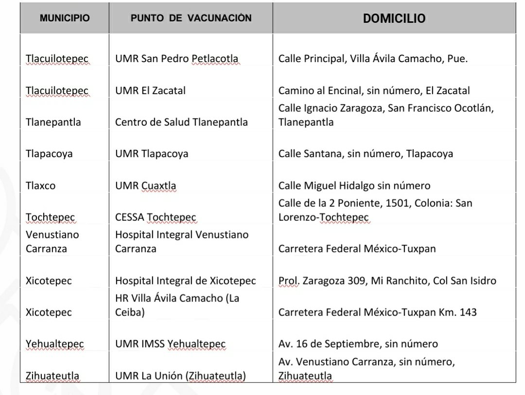 Los puntos de aplicación del biológico podrán consultarse en la siguiente liga: https://previenecovid19.puebla.gob.mx/vacuna, así como en las redes sociales oficiales: @SaludGobPue y Secretaría de Salud Puebla (Twitter y Facebook, respectivamente). Lo anterior, para contribuir a la realización de un proceso ágil y ordenado.