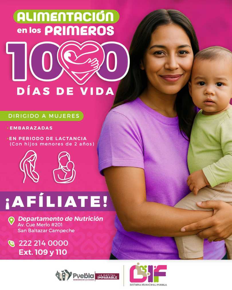 El DIF Puebla Capital por instrucciones de su presidenta del Patronato MariElise Budib, invita a mujeres embarazadas, en periodo de lactancia, y con hijas o hijos menores de 2 años de edad a inscribirse al programa de «Atención alimentaria en los primeros mil días de vida», el cual tiene como objetivo mejorar su estado nutricional durante una de las etapas más importantes del desarrollo infantil.