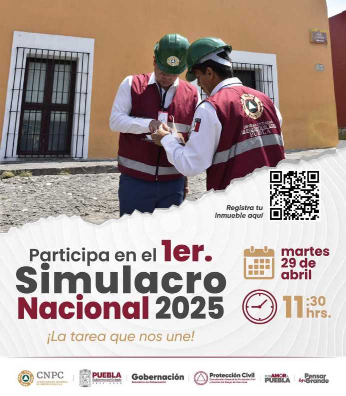 A fin de promover una cultura de prevención, el Gobierno del Estado de Puebla que encabeza el gobernador Alejandro Armenta, a través de la Coordinación General de Protección Civil y Gestión del Riesgo de Desastres, exhorta a la población a participar en el primer “Simulacro Nacional 2025”, que se llevará a cabo el 29 de abril a las 11:30 horas, donde participarán dependencias de los tres niveles de gobierno.