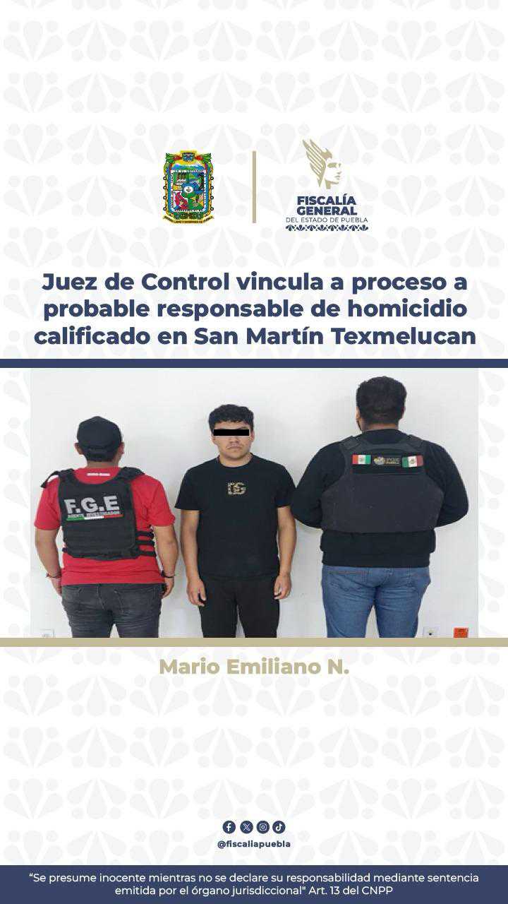 La Fiscalía General del Estado logró que el Juez de Control vinculara a proceso a Mario Emiliano N., por su probable responsabilidad en la comisión del delito de homicidio calificado, ocurrido en el municipio de San Martín Texmelucan.