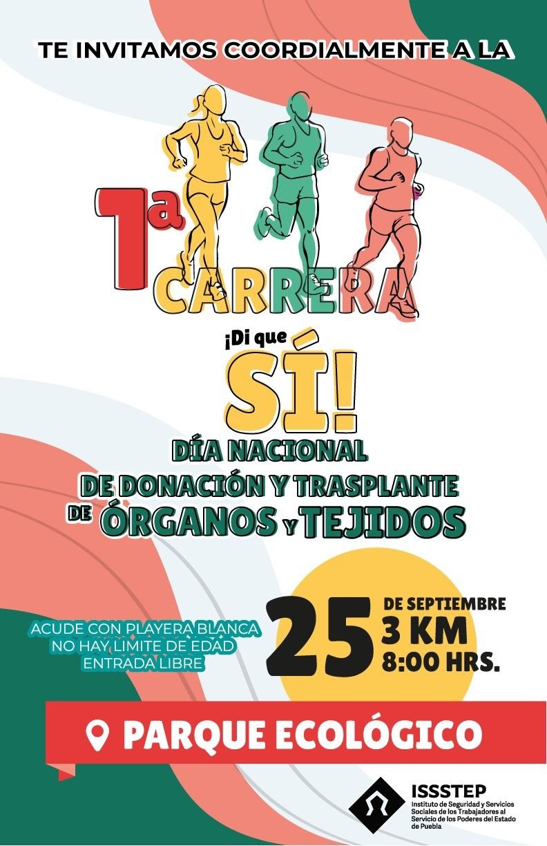 En el marco del Día Nacional de Donación y Trasplante de Órganos y Tejidos, conmemorado el 26 de septiembre, el ISSSTEP llevará a cabo la Carrera “¡Di que sí!” el domingo 25 de septiembre, a las 08:00 horas, en el Parque Ecológico ubicado en calle 24 Sur, colonia Azcarate, Puebla, Pue.
