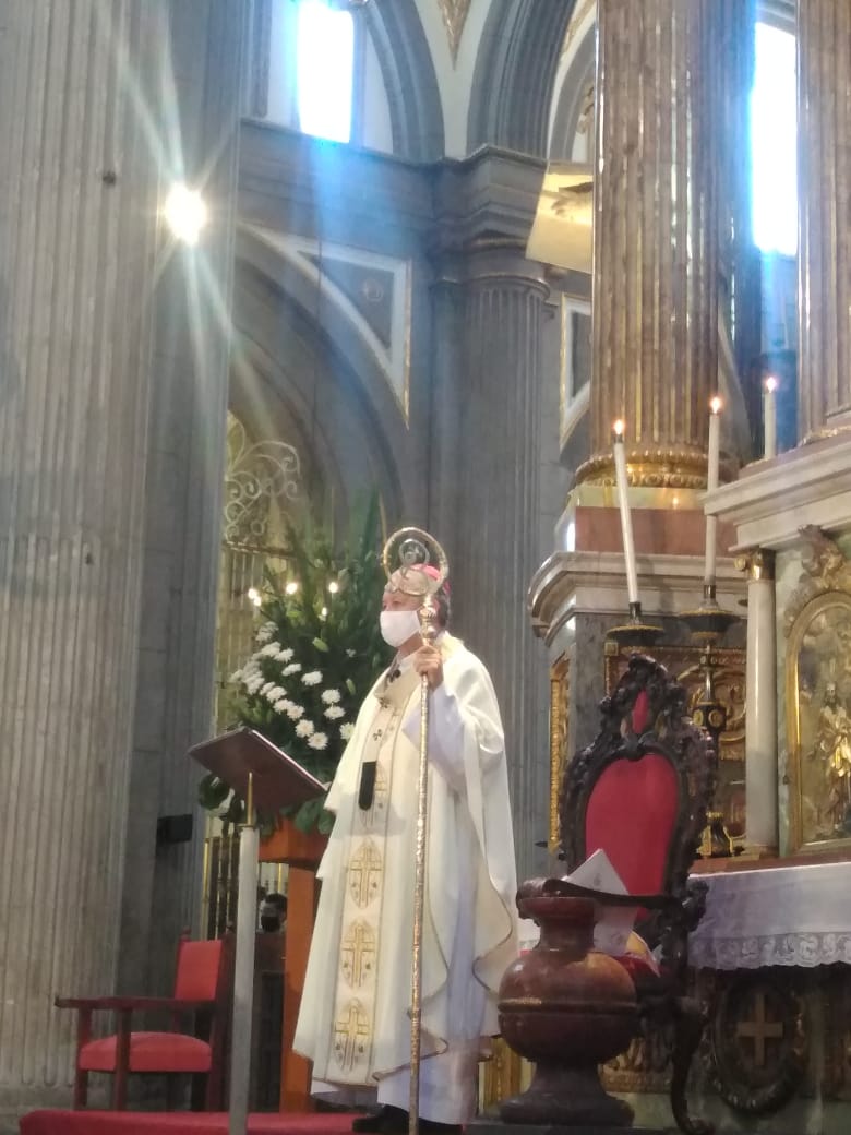 Durante la celebración eucarística recordó que hoy hace 372 años la Catedral de Puebla fue consagrada por el beato Juan de Palafox y Mendoza, por lo que Monseñor pido al señor por Puebla y encomendó a los Santos Ángeles a la Ciudad y a sus habitantes.