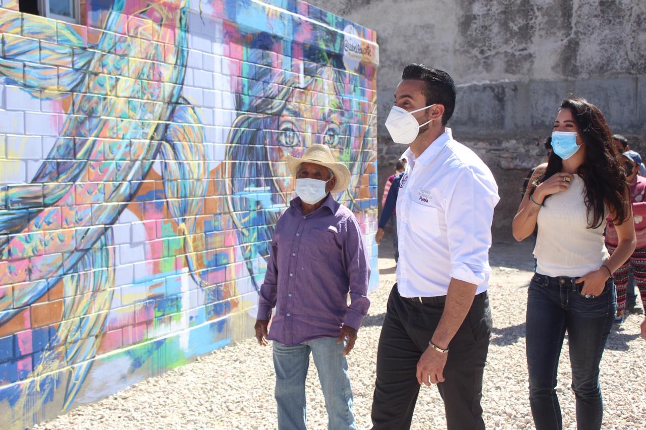 Esta vivienda fue intervenida a través de un mural de la artista poblana, Isabel Pérez Duarte, quién plasmó a una de las nietas del beneficiario.
