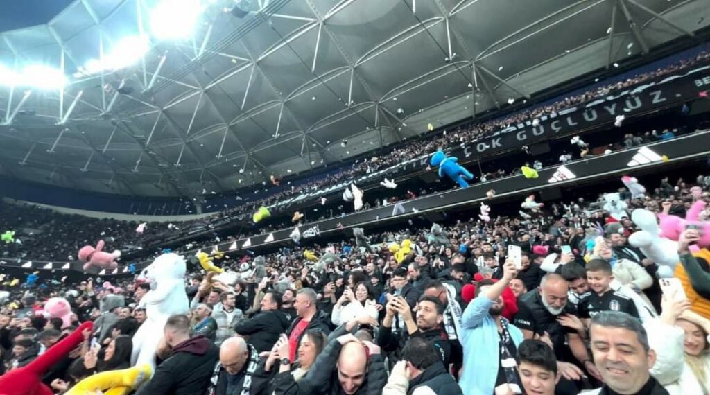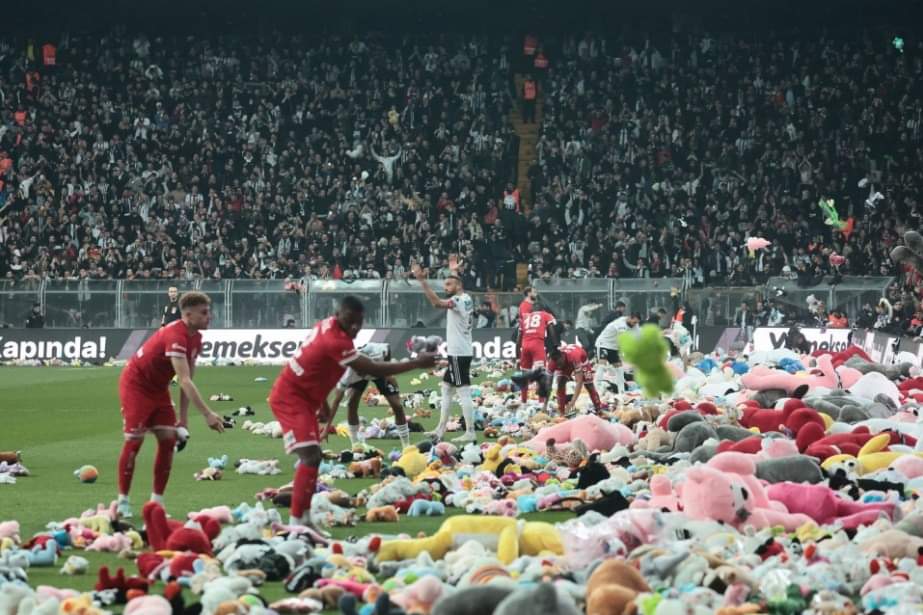 Aficionados del Besiktas de Turquía lanzaron cientos de peluches al campo para los niños afectados por el reciente terremoto.
