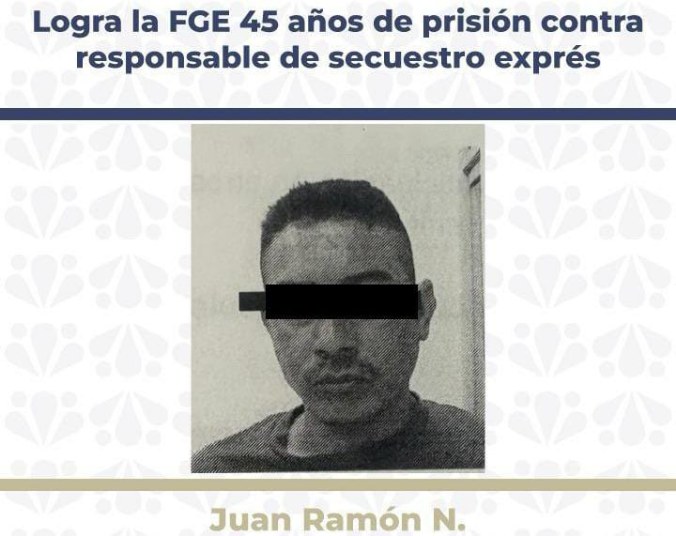 La Fiscalía General del Estado de Puebla logró una sentencia de 45 años de prisión en contra de Juan Ramón N., responsable del delito de secuestro exprés.