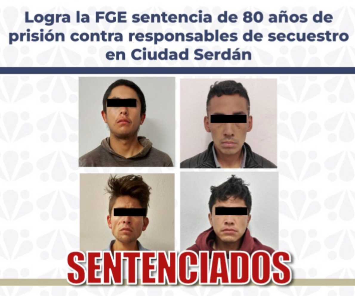 La Fiscalía General del Estado de Puebla obtuvo sentencia condenatoria de 80 años de prisión en contra de Jonathan N., Pedro N., Antonio de Jesús N. y Luis Damián N., como responsables del delito de secuestro agravado cometido en agravio de un hombre, en el municipio de Ciudad Serdán, Puebla.