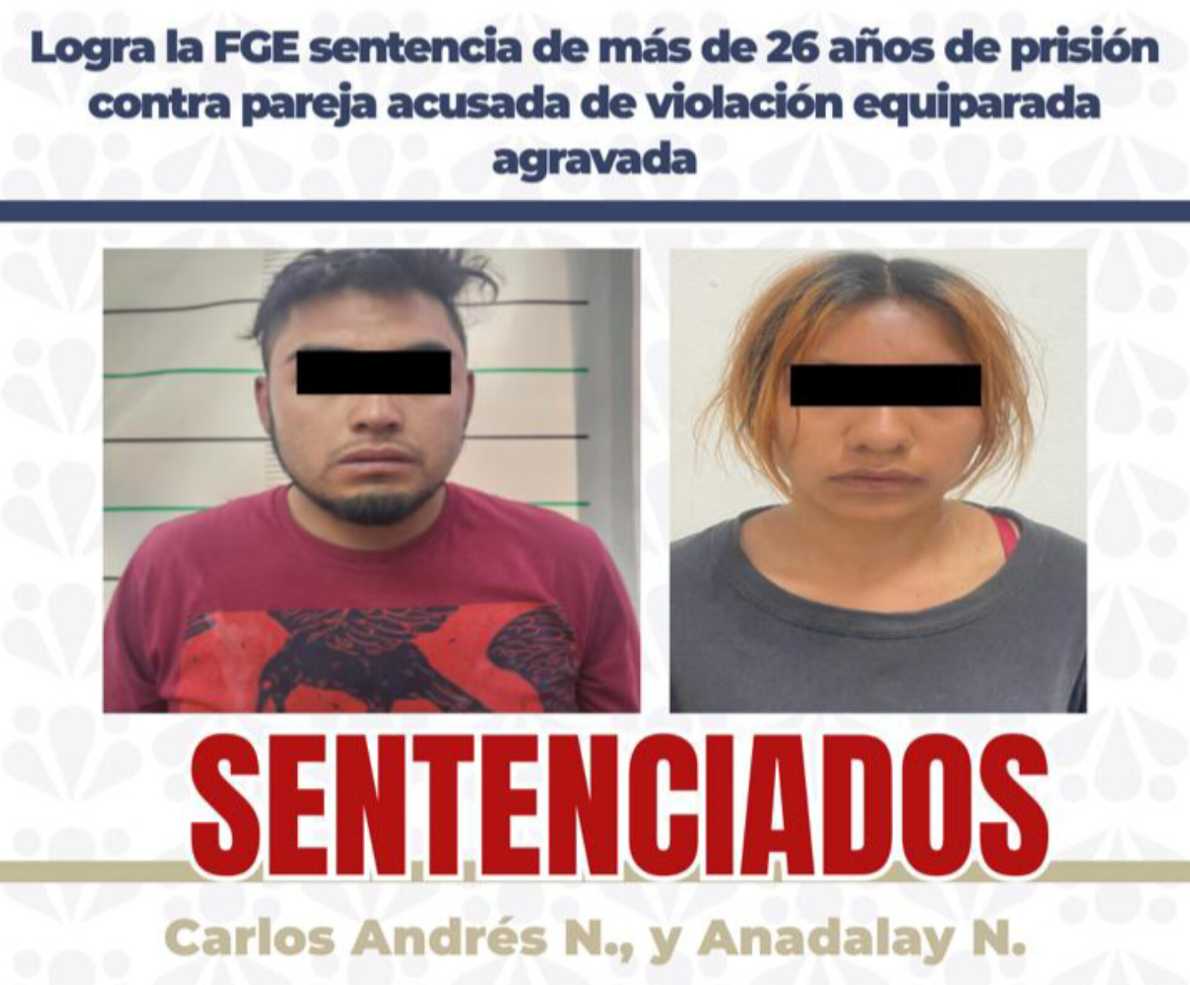 Como resultado de la aportación de diversos medios de prueba por parte de la Fiscalía General del Estado, se logró una sentencia superior a los 26 años de prisión por el delito de violación equiparada agravada en contra de Anadalay N. y Carlos Andrés N., madre y padrastro de la víctima de 4 años de edad.